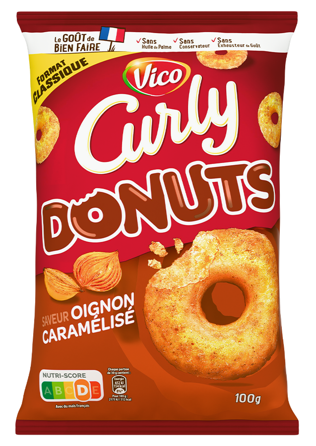 Notre Curly Donuts revient avec une nouvelle saveur ultra gourmande : oignons caramélisés. Un goût sucré-salé inédit et une forme fun pour un max de gourmandise !